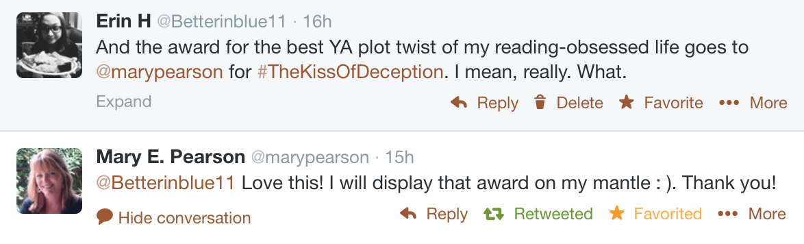 BUT, OH MY GOSH, THE PLOT TWIST. The absolute best plot twist of my life. I said as much in my tweet to her (and gahh, she replied).